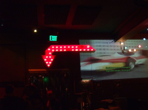 Aside from this very cool neon letting the bar clientele know that live music has begun in the other room, Hemlock’s other, er, idiosyncratic feature was the fact that the only thing separating the Mens restroom “number ones” receptacle from its “number twos” was a black polythene curtain that did not touch the ground. If one felt daring enough for number twos, the ways of ascertaining the status of said receptacle were: